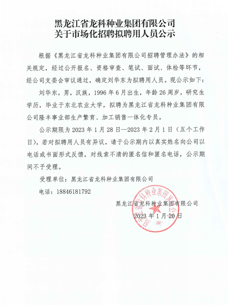 黑龙江省龙科种业集团有限公司关于市场化招聘拟聘用人员公示