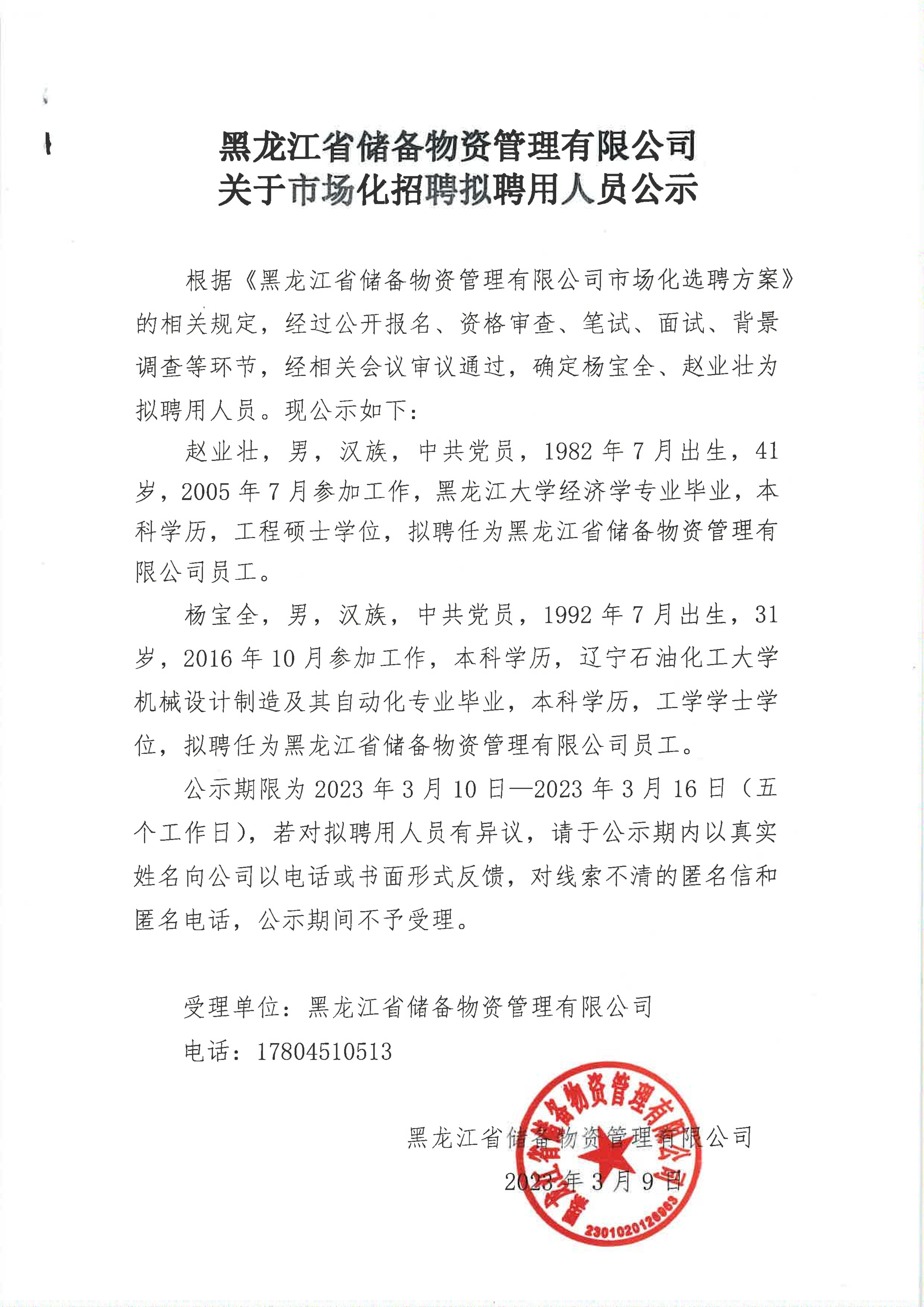 黑龙江省储备物资管理有限公司关于市场化招聘拟聘用人员公示