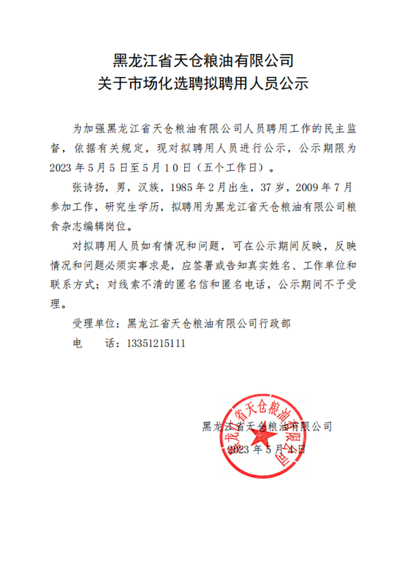 黑龙江省天仓粮油有限公司关于市场化选聘拟聘用人员公示