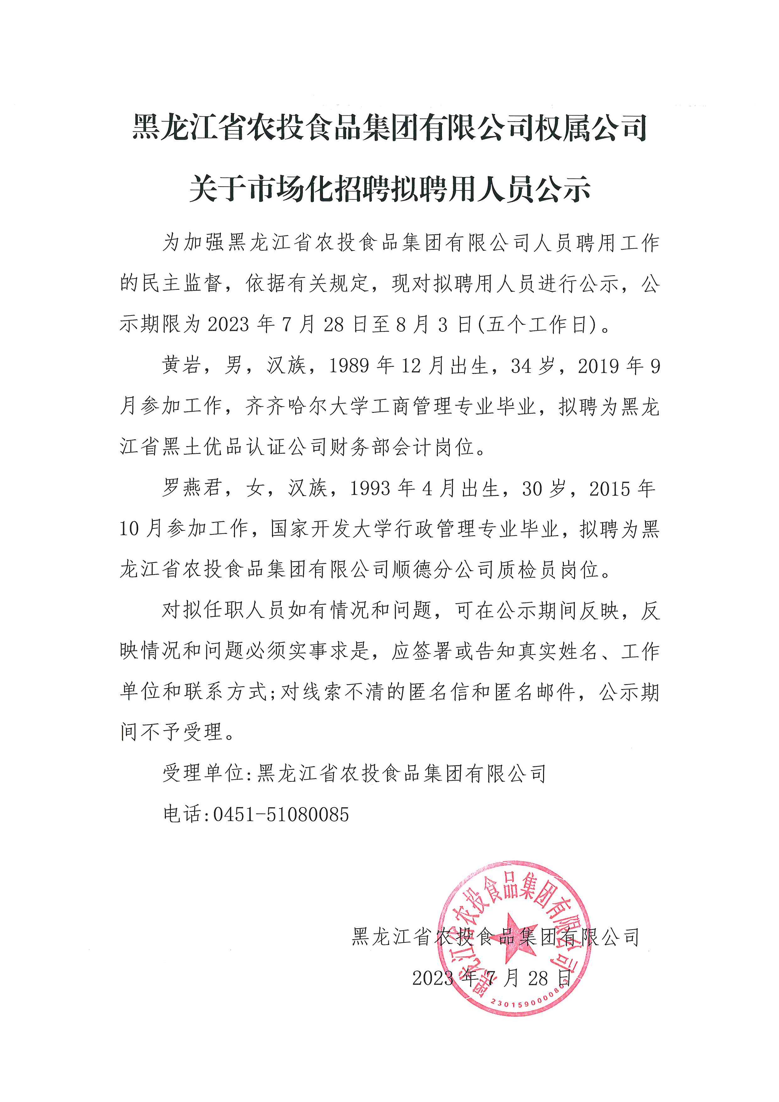 黑龙江省农投食品集团有限公司权属公司关于市场化招聘拟聘用人员公示