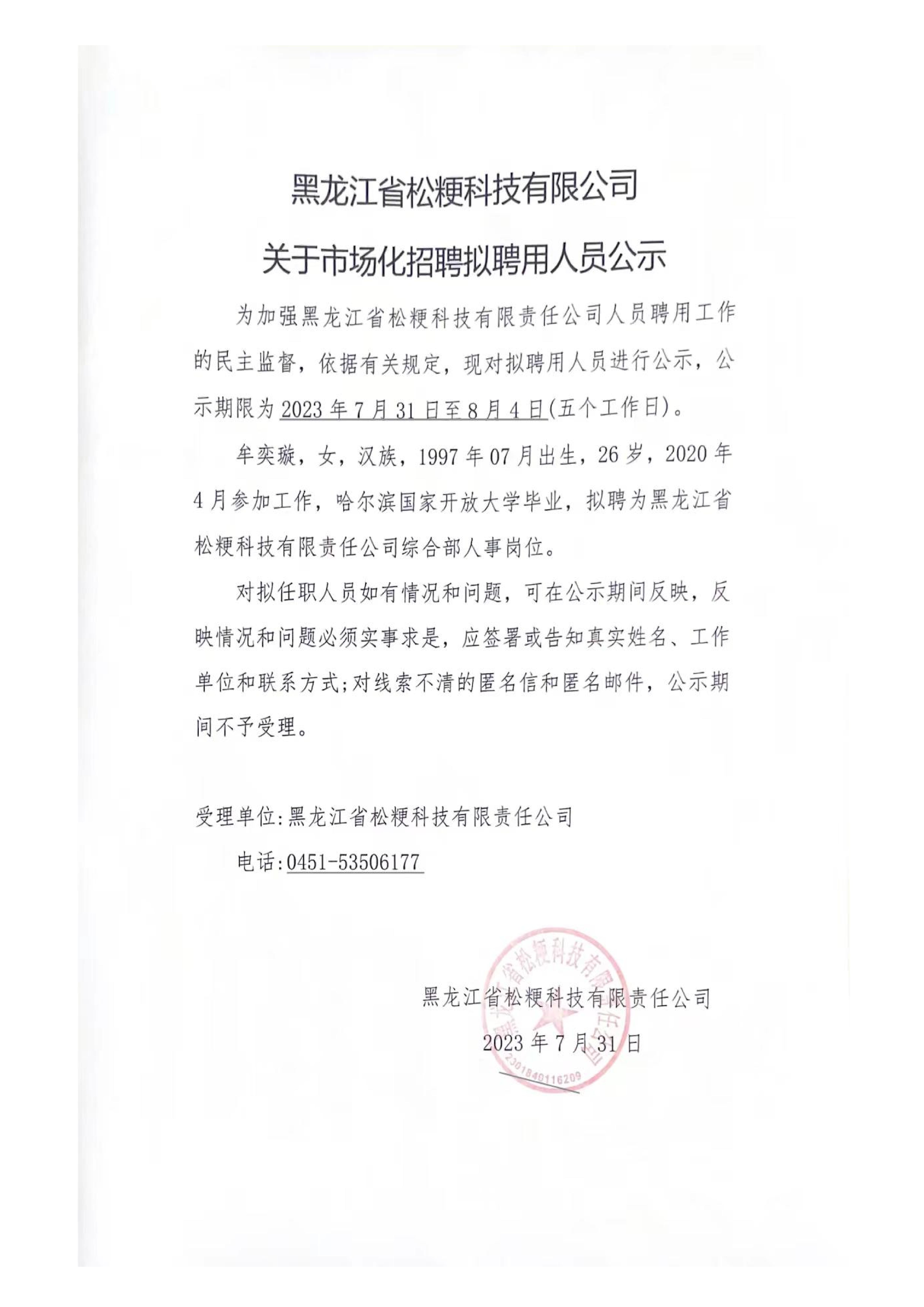黑龙江省松粳科技有限责任公司关于市场化招聘拟聘用人员公示