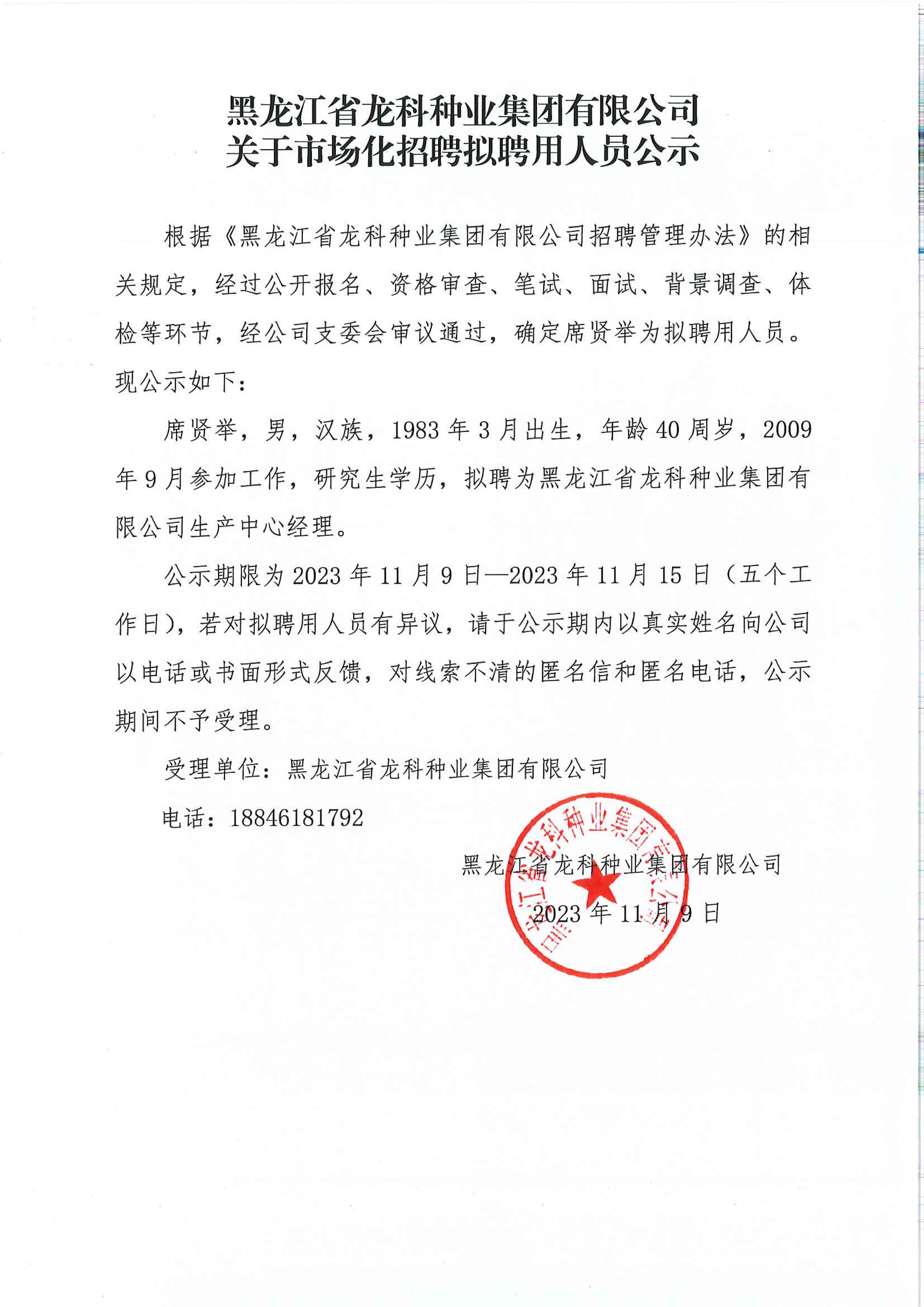 黑龙江省龙科种业集团有限公司关于市场化招聘拟聘用人员公告