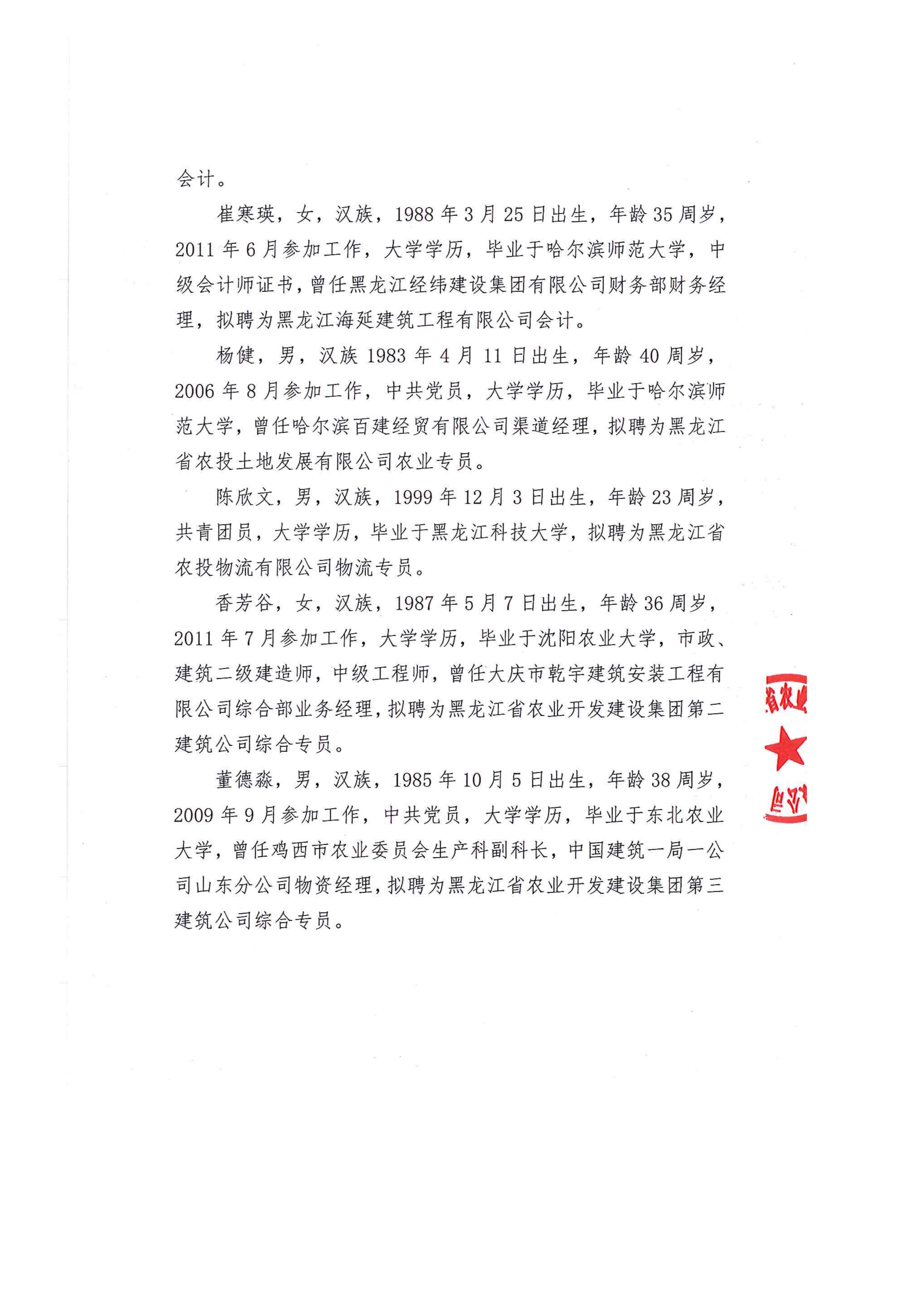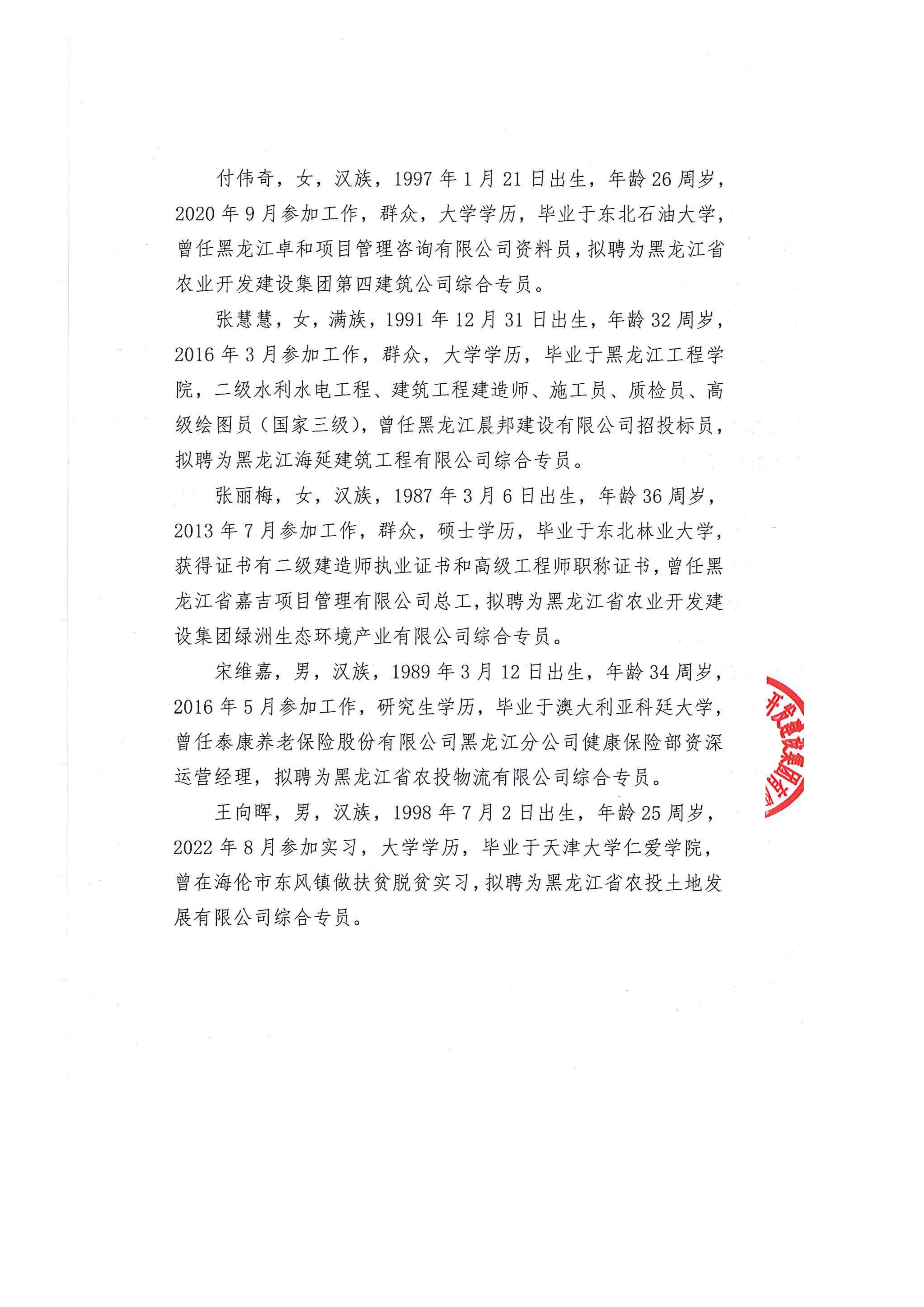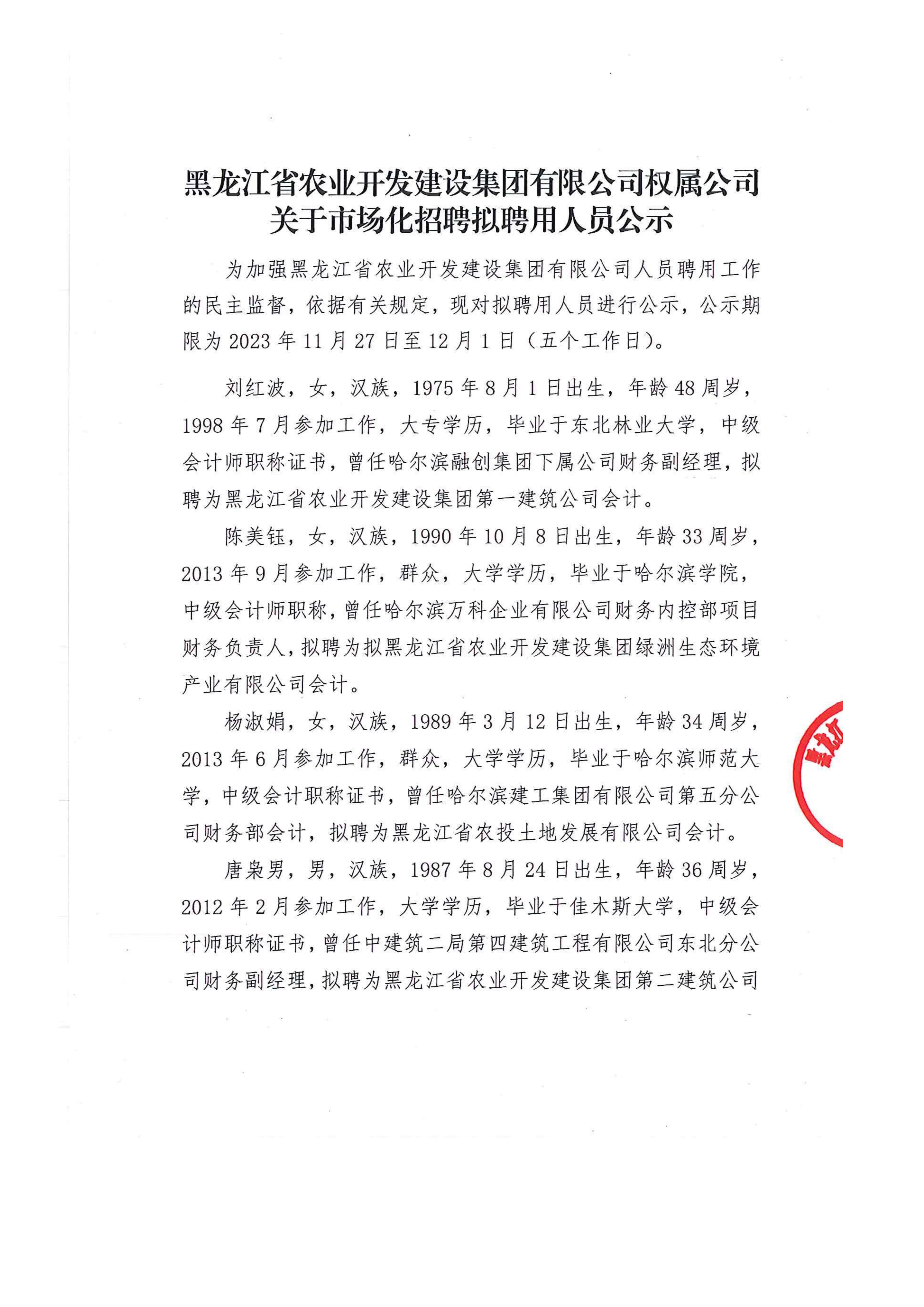 黑龙江省农业开发建设集团有限公司权属公司关于市场化招聘拟聘用人员公示