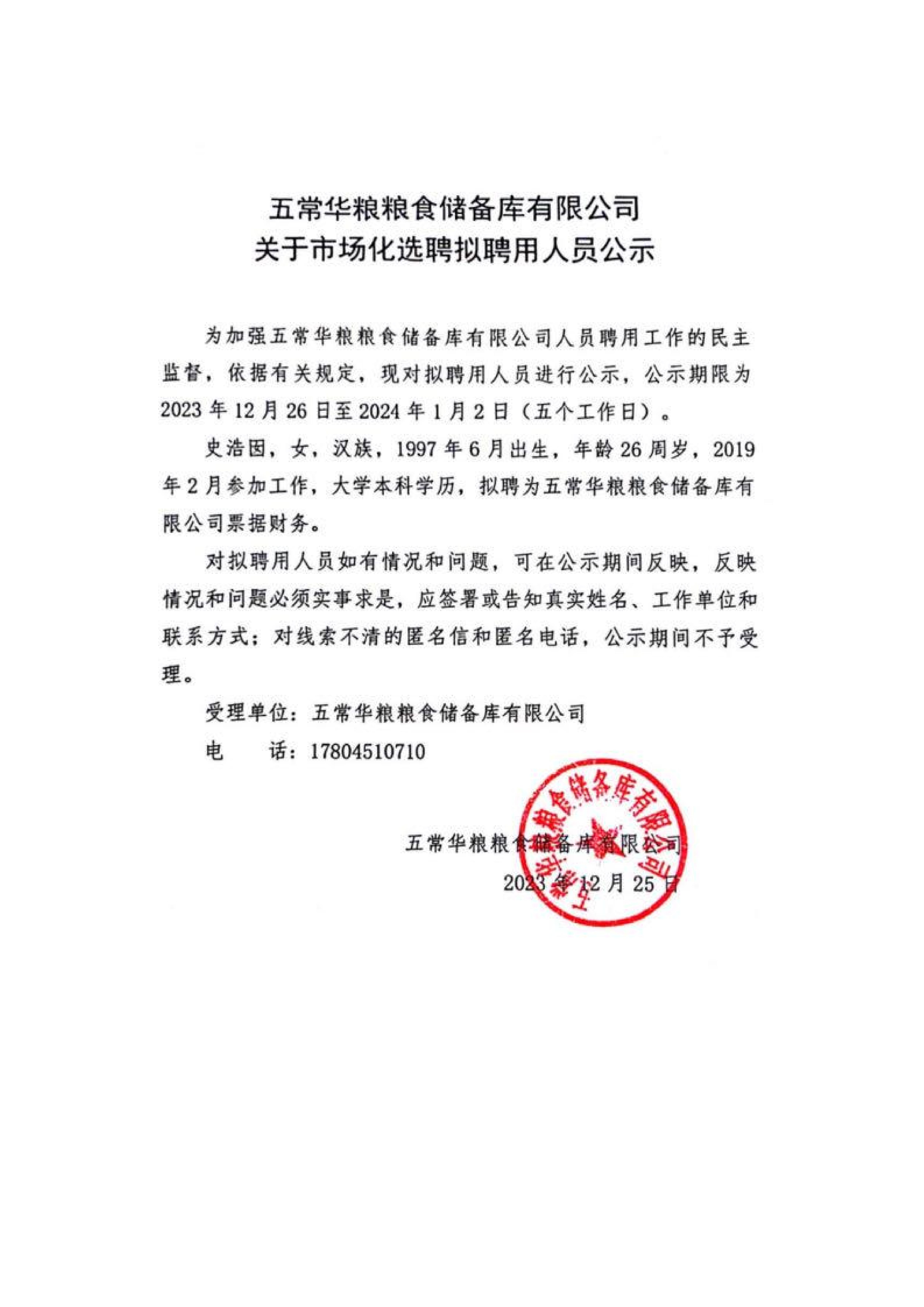五常华粮粮食储备库有限公司关于市场化选聘拟聘用人员公示
