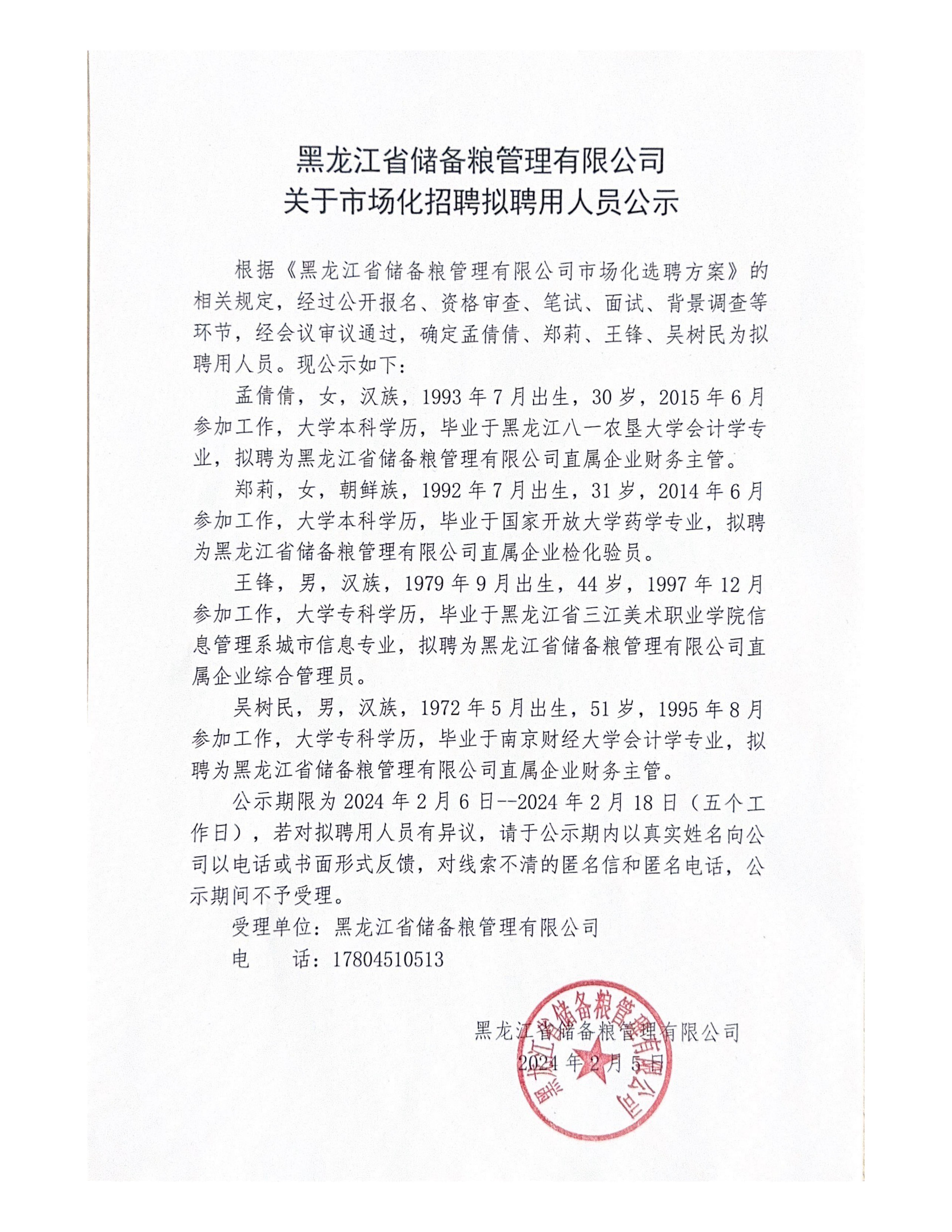 黑龙江省储备粮管理有限公司关于市场化招聘拟聘用人员公示