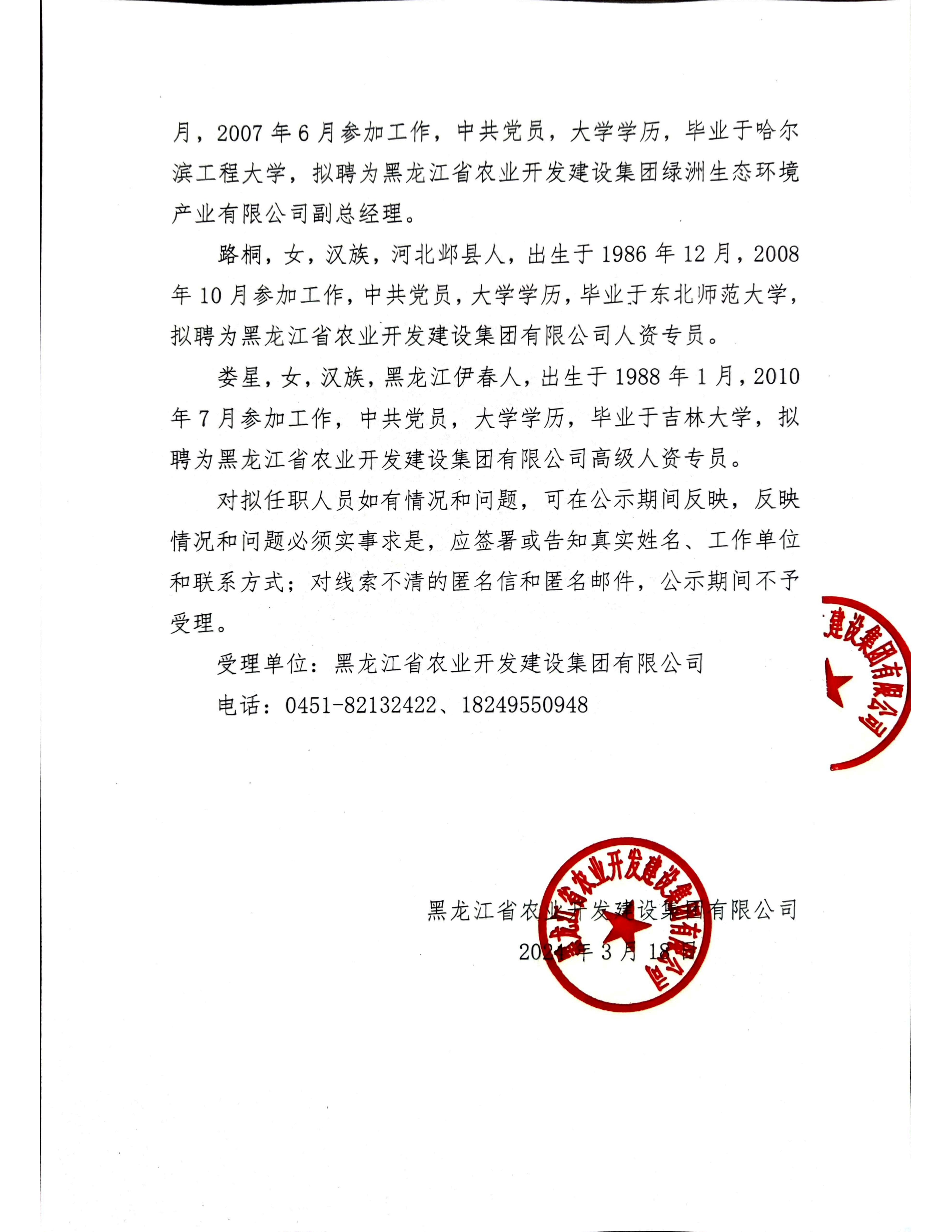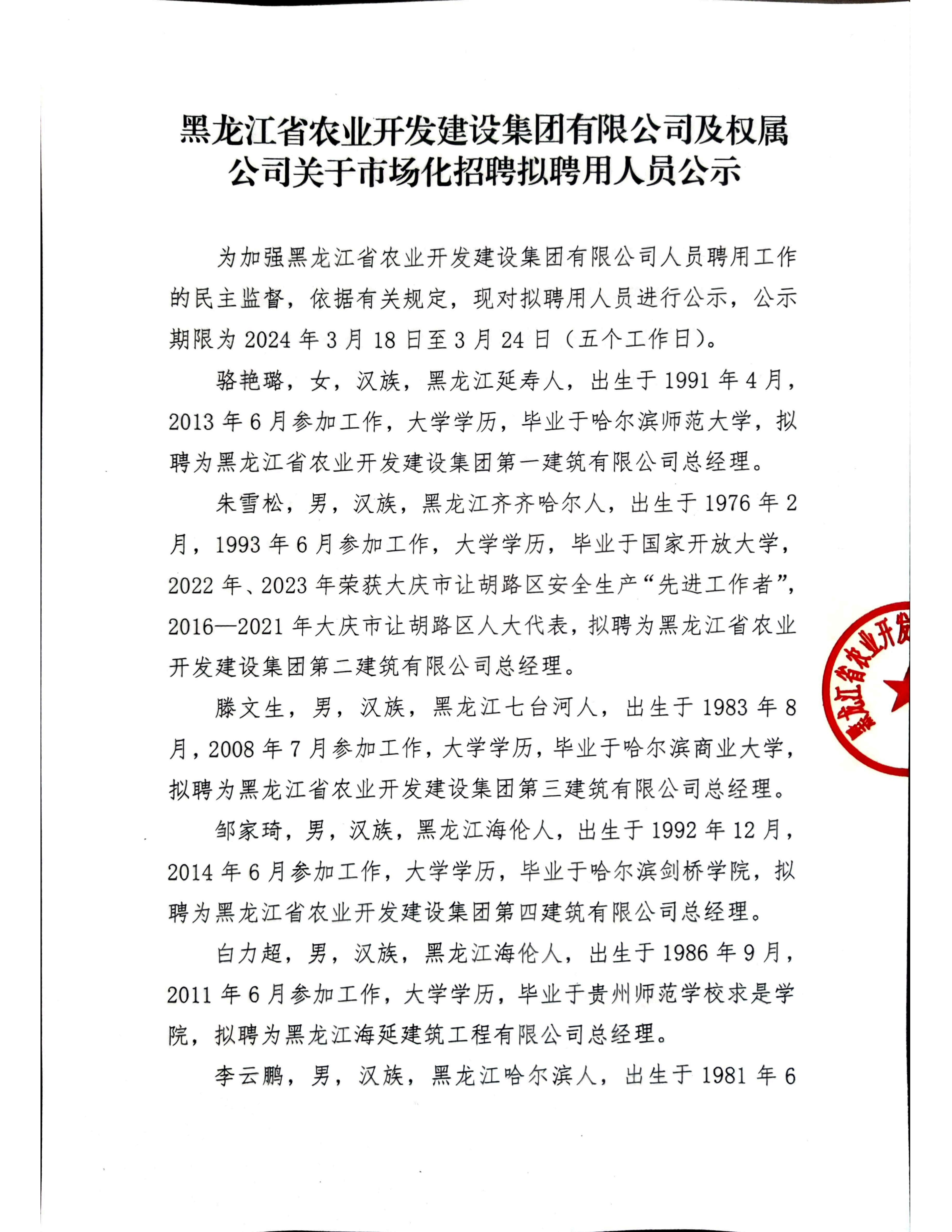 黑龙江省农业开发建设集团有限公司及权属公司关于市场化招聘拟聘用人员公示