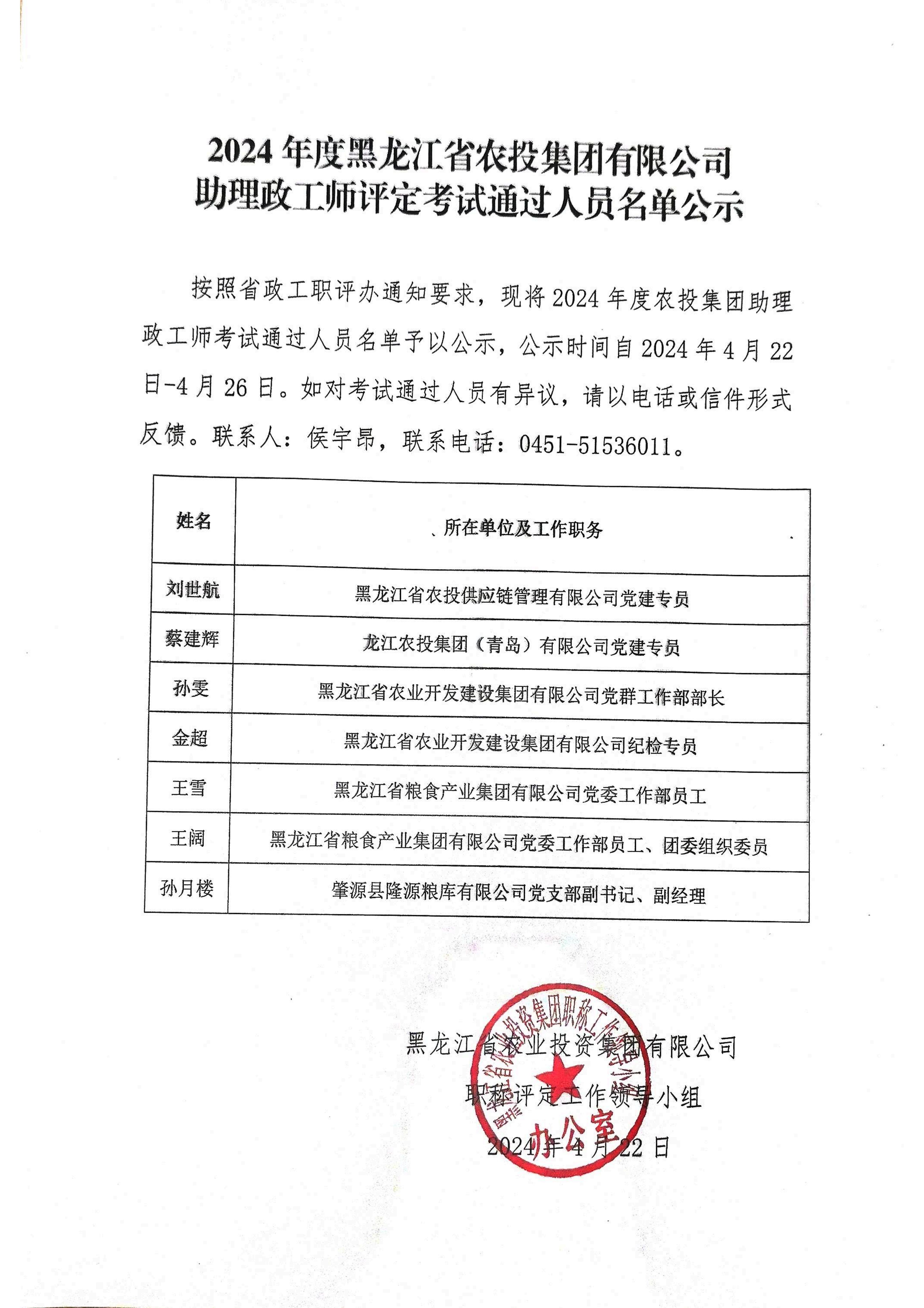 2024年度黑龙江省农投集团有限公司助理政工师评定考试通过人员名单公示