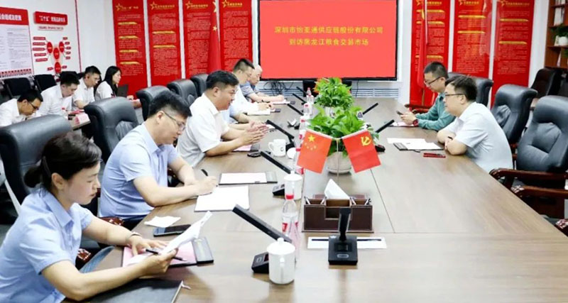 近日,深圳市怡亚通供应链股份有限公司总经理助理、战略客户事业部总经理陈聪一行到访黑龙江粮食交易市场,并围绕相关合作事宜举行座谈交流。农投集团总经理助理、粮食交易市场党支部书记、董事长魏志伟参加座谈。