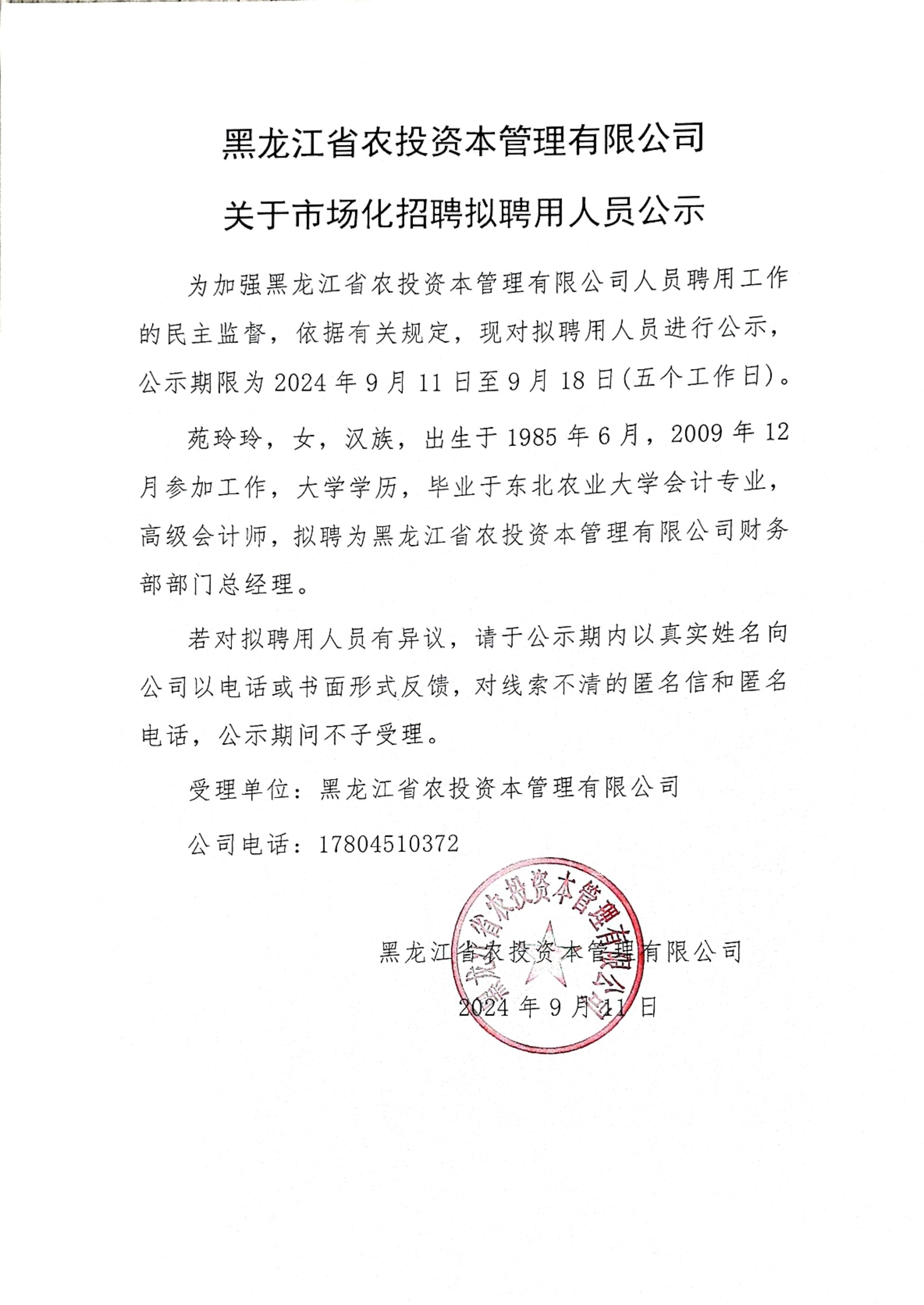 黑龙江省农投资本管理有限公司关于市场化招聘拟聘用人员公示