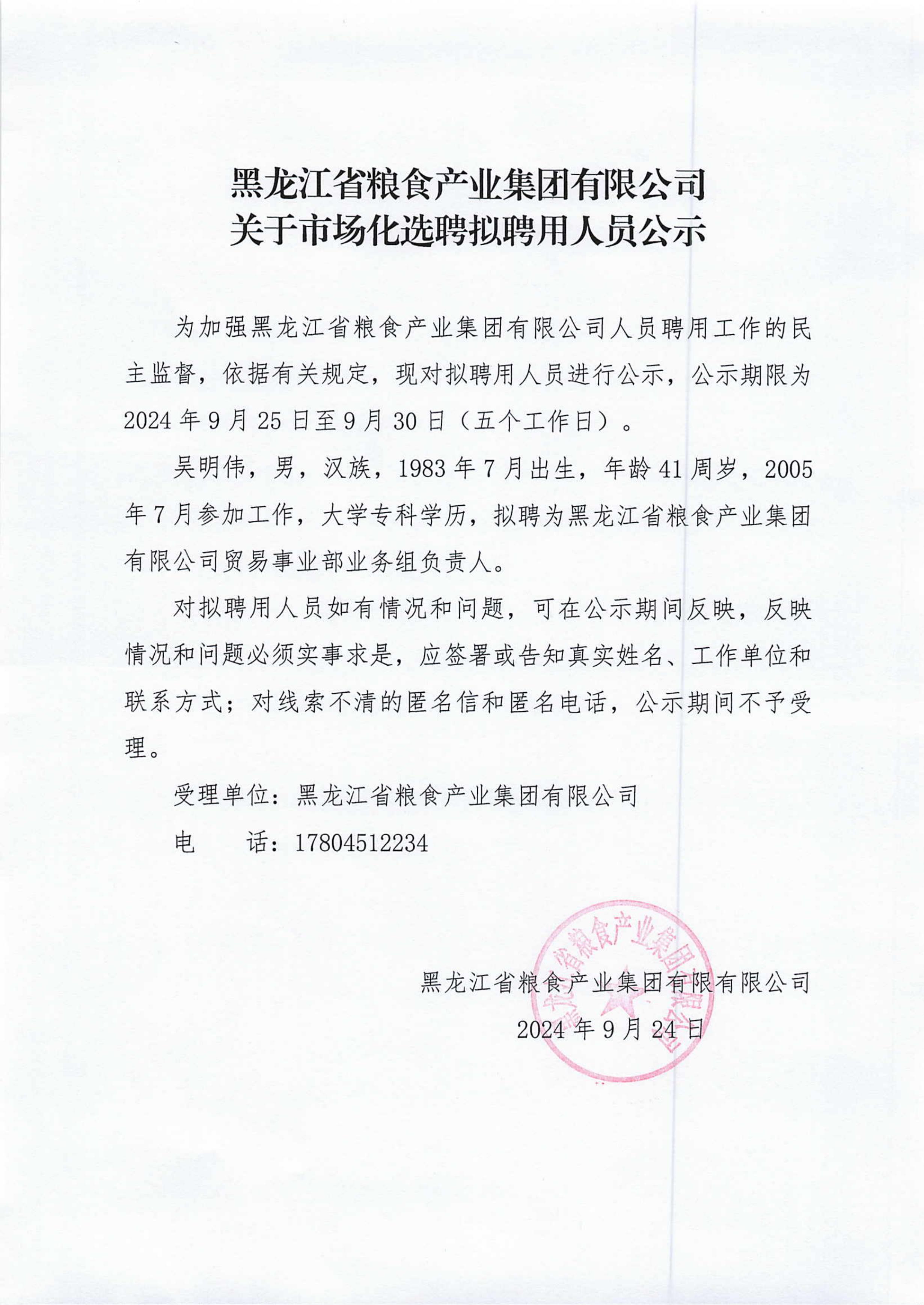 黑龙江省粮食产业集团有限公司关于市场化选聘拟聘用人员公示