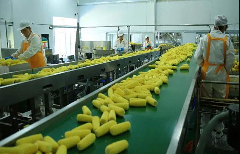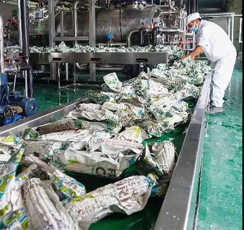 国庆期间,因为农产品行业的特殊性,龙疆金谷人无法休息,工厂里,新鲜采摘的甜玉米堆满操作间,生产车间满是鲜甜玉米诱人的甜香,工人们穿着统一工装,在各项加工设备前进行着操作。鲜玉米通过机械传送带进入加工流水线,在经过脱皮、分拣、蒸煮、消毒、清洗等多道工序后最终成为待售的鲜玉米。