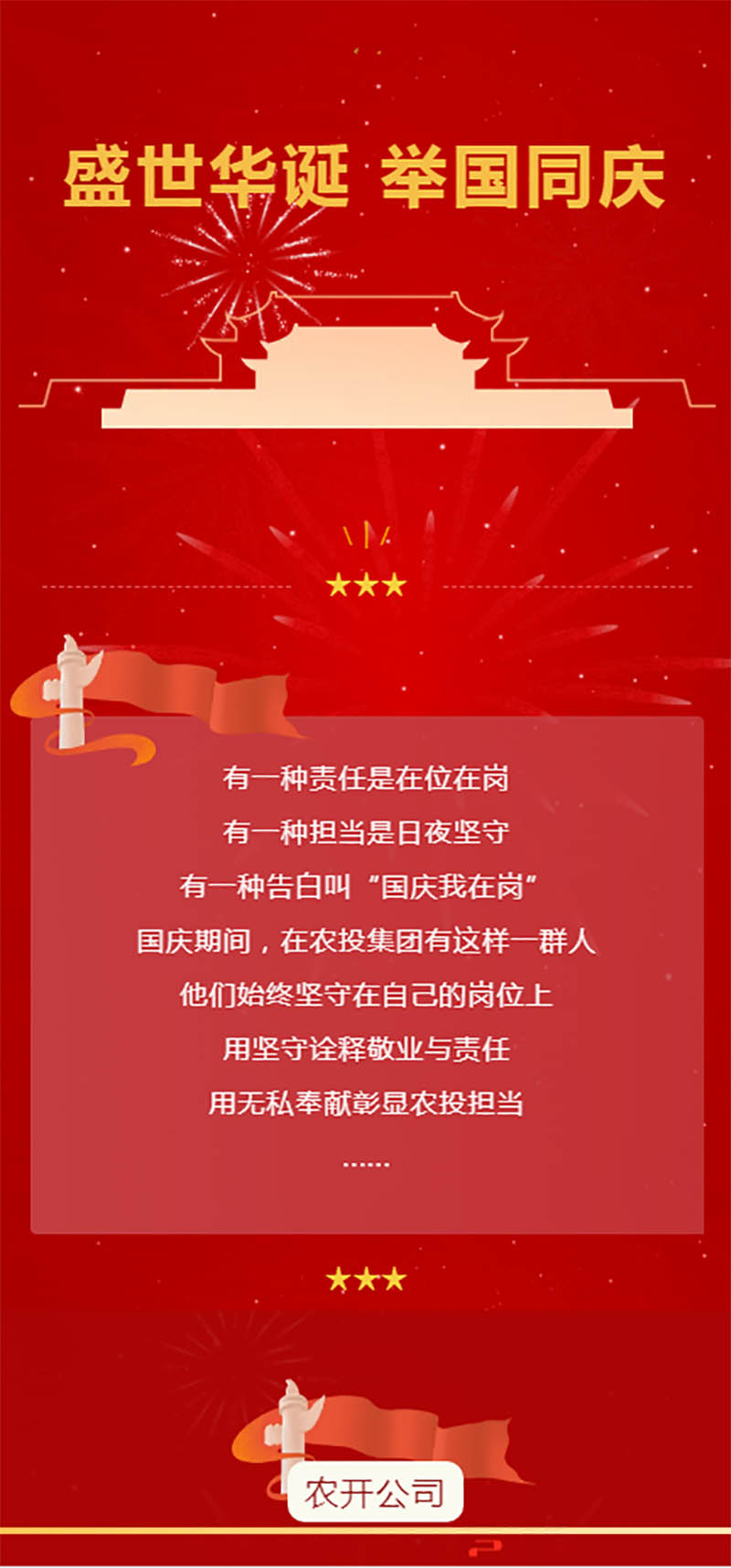 秋阳璀璨,金风送爽。在国庆佳节之际,农开公司的全体员工深知使命与职责,时刻准备、迅速响应,以更为饱满的热情、更为专注的态度、更为卓越的执行力,坚守岗位,他们忙碌的身影穿梭在各个角落。为了保障农业基础设施的建设,为了推动乡村振兴的步伐。他们以实际行动向中华人民共和国成立 75 周年献礼,用汗水和奉献诠释着对祖国的热爱与忠诚。