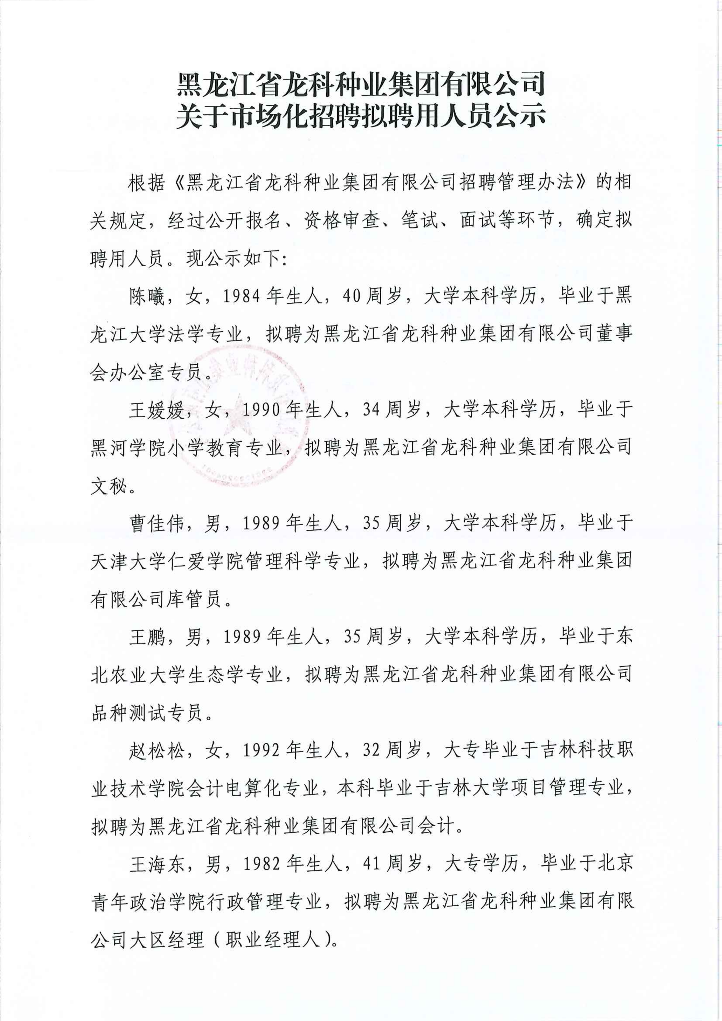 黑龙江省龙科种业集团有限公司关于市场化招聘拟聘用人员公示