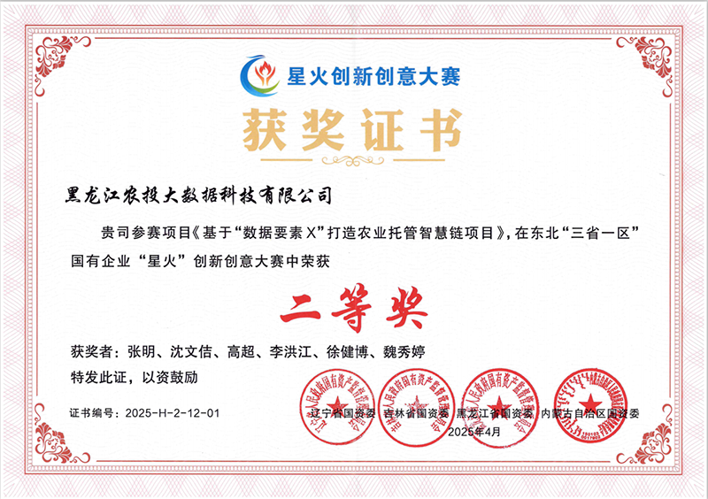 东北“三省一区”山水相连、人文相亲、产业相融,国资国企发展资源优势和条件机遇相似,在科技创新合作有着深厚基础。 2024年11月至2025年4月,辽宁省国资委、吉林省国资委、黑龙江省国资委、内蒙古自治区国资委联合举办了东北“三省一区”国有企业“星火”创新创意大赛,“三省一区”的161个项目分获一、二、三等奖。农投大数据公司凭借“基于‘数据要素×’打造农业托管智慧链项目”从全省百余个参赛项目中脱颖而出,荣获大赛二等奖。