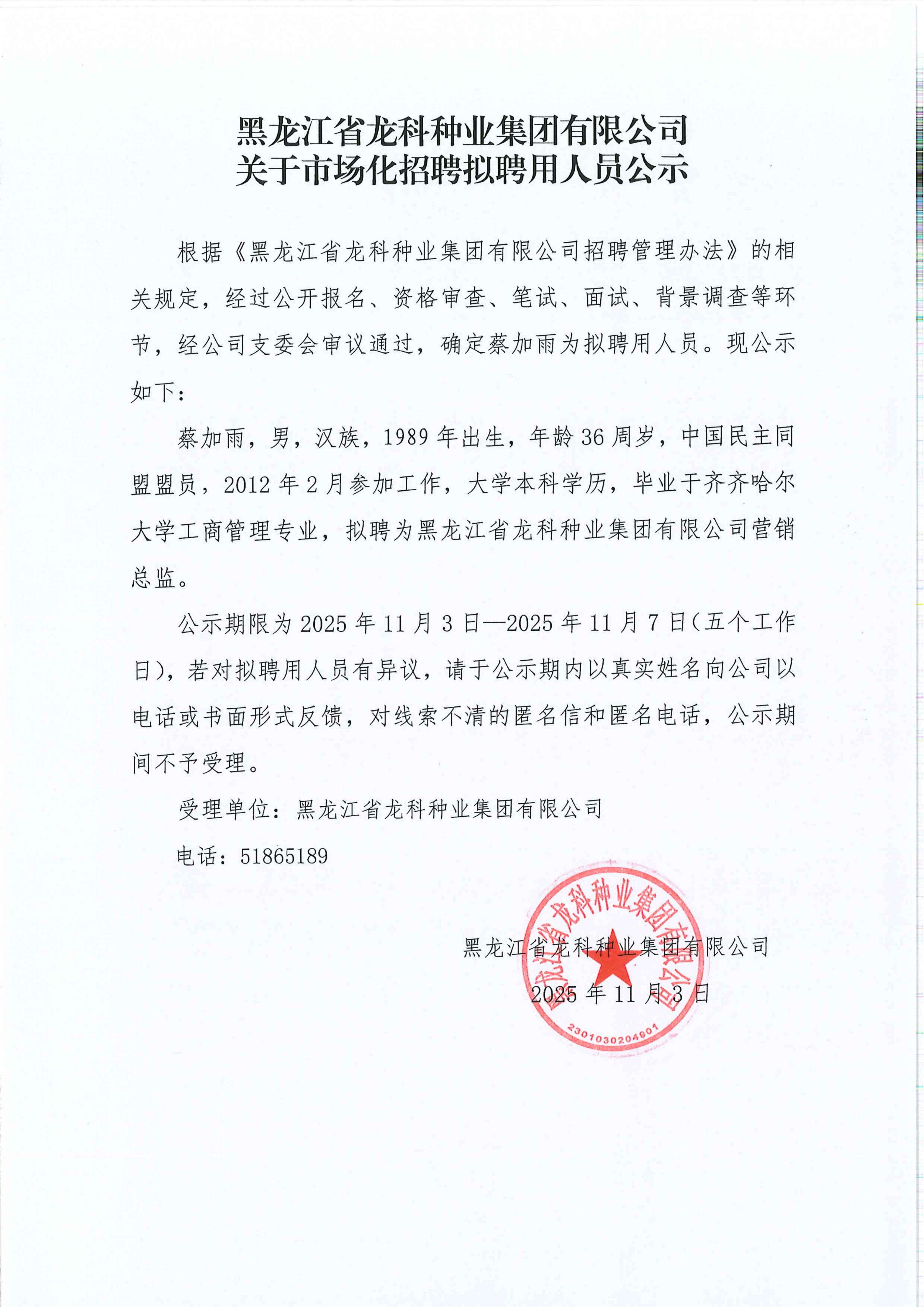 黑龙江省龙科种业集团有限公司关于市场化招聘拟聘用人员公示