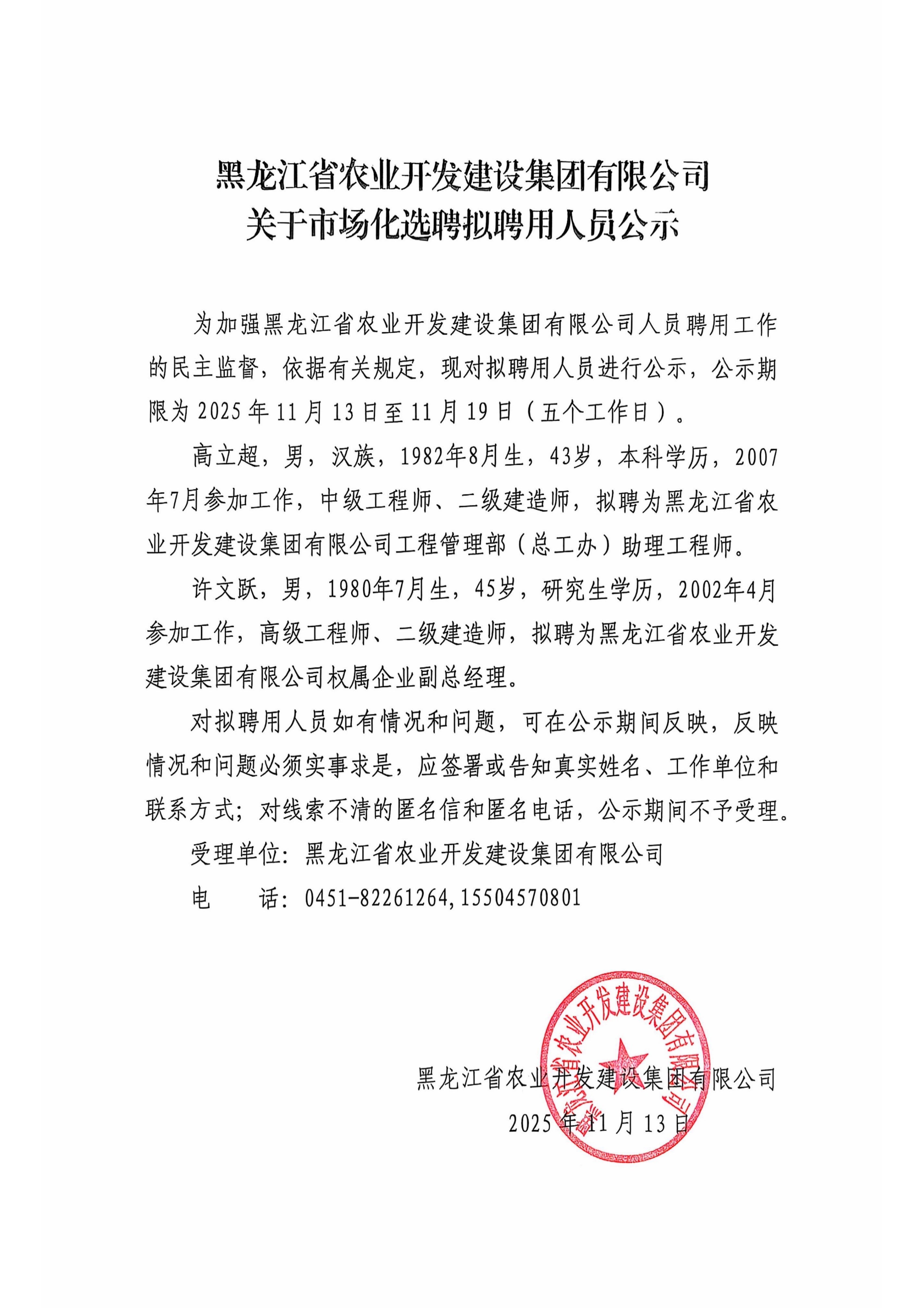 黑龙江省农业开发建设集团有限公司关于市场化选聘拟聘用人员公示