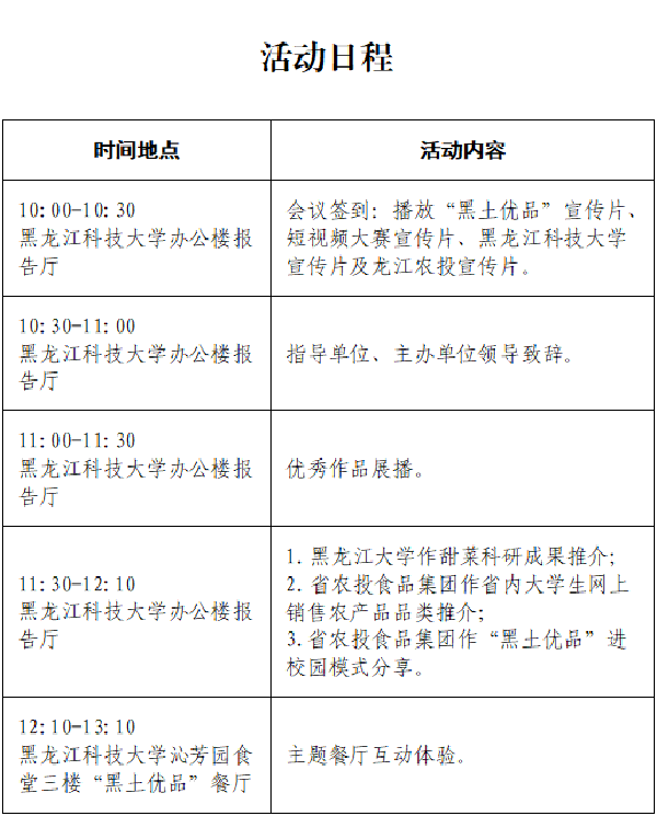 活动将集中展播“黑土优品”农产品短视频创意设计大赛优秀作品,开展农业科技成果与品牌营销模式专题推介、主题餐厅互动体验等。