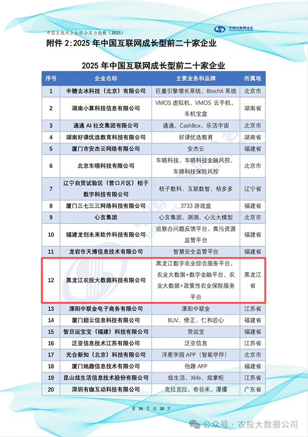 近日,《中国互联网企业综合实力指数(2025)发布会》在京举行。农投大数据公司凭借在农业数字化领域的持续深耕与扎实成果,成功入选“2025年中国互联网成长型前二十家企业”,位列第12名。这已是公司连续第三年荣登该榜单。