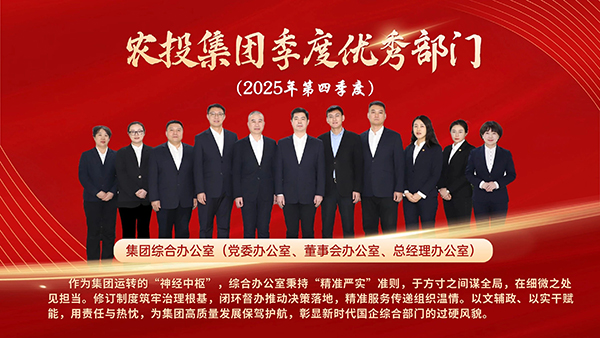 为表彰先进,树立典型,有效激发农投集团总部全体员工的工作热情、主动性和创造力,农投集团总部对季度优秀部门和优秀员工开展评选工作。集团综合办公室(党委办公室、董事会办公室、总经理办公室)被评为集团总部2025年第四季度“优秀部门”、党委组织部(人力资源部)科长徐光宇被评为集团总部2025年第四季度“优秀员工”。